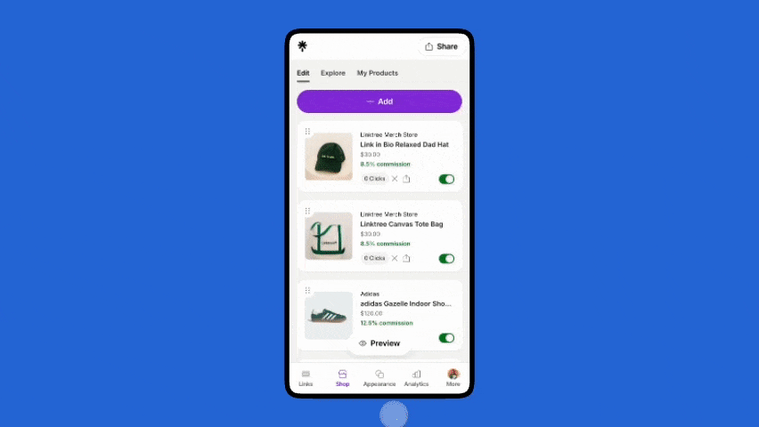Linktree Shops enables creators to curate their own Shop with products they love, and earn commissions in less clicks.